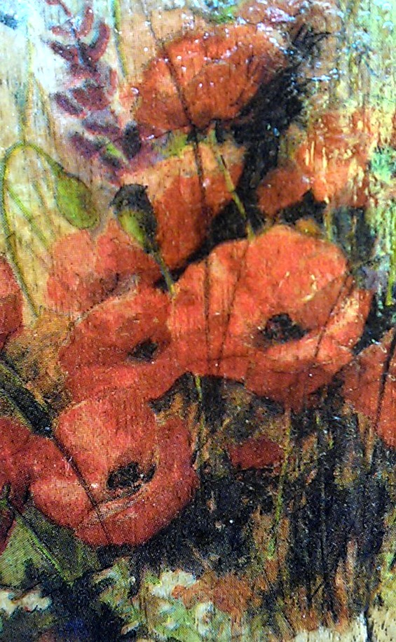 Έκανα τις σκιάσεις με πατίνα και με ακρυλικά με retarder και τέλος του πέρασε ένα κρακελέ ONE STEP του οποίου τα σκασίματα γέμισα με 'σπιτικό' bitumen (καφέ βερνίκι παπουτσιών αραιωμένο με διαλυτικό).