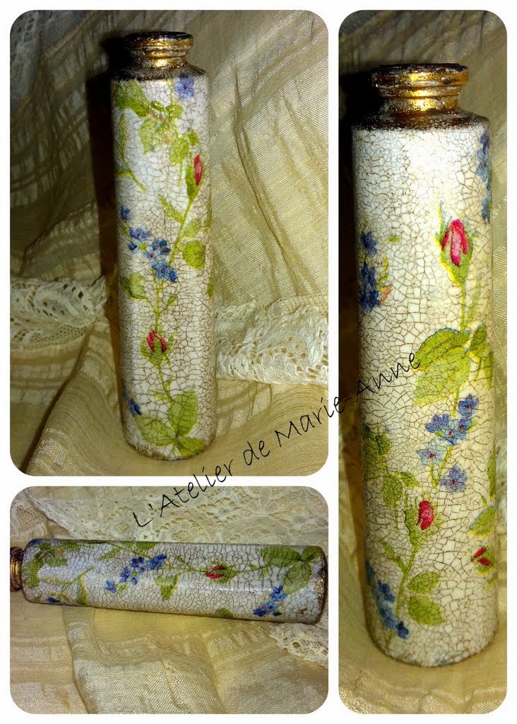 Merci, Marie-Paule!!!! Il est vrai que j’adore décorer les flacons de parfum , d’un côté par ce qu’ils ont de belles formes mais aussi parce qu’ils sont petits et c’est donc plus facile et plus rapide que pour une grande bouteille. De plus, ce medium à craqueler convient aux petites surfaces (pour les flacons précédents,car celui-ci est seulement en dentelle).