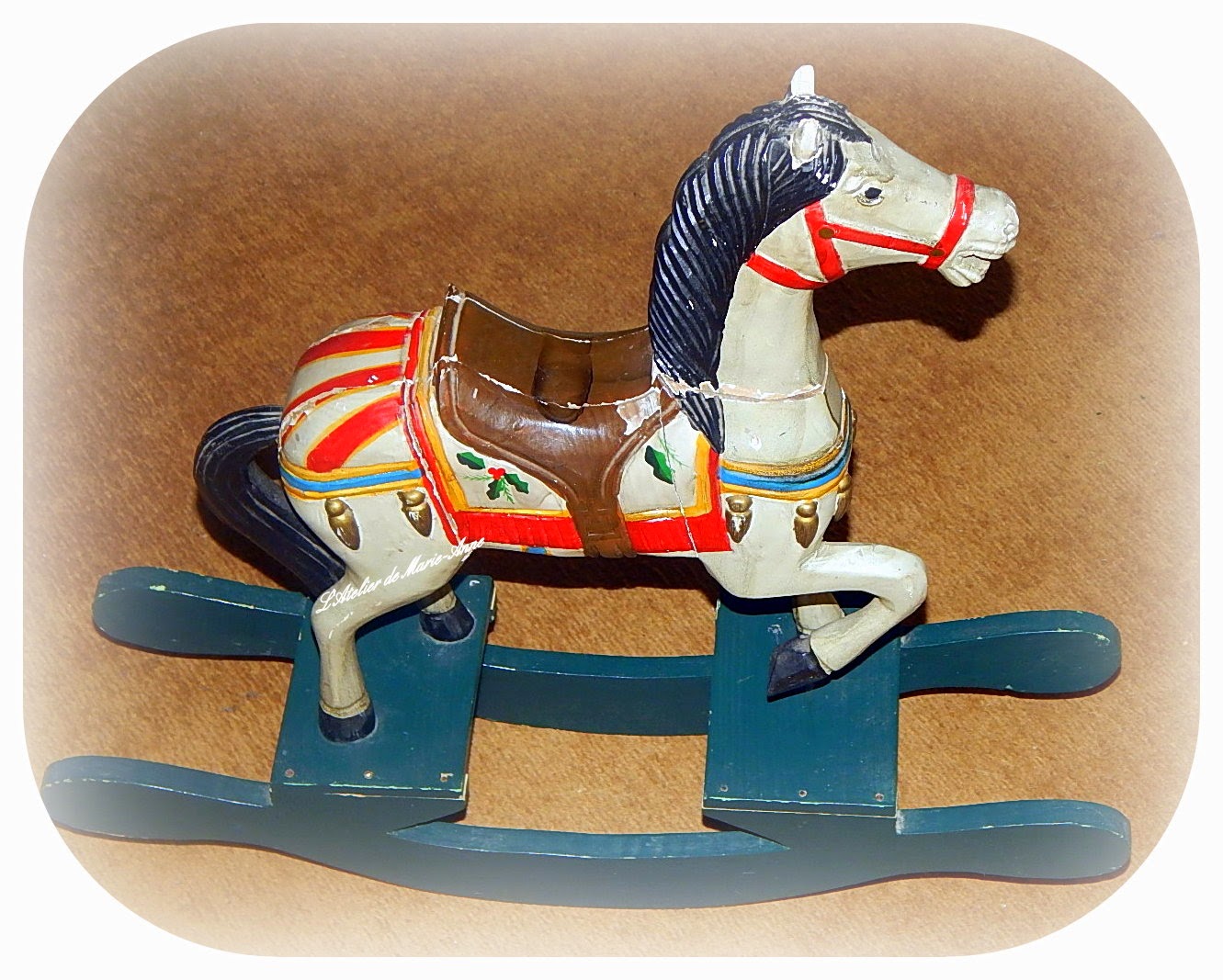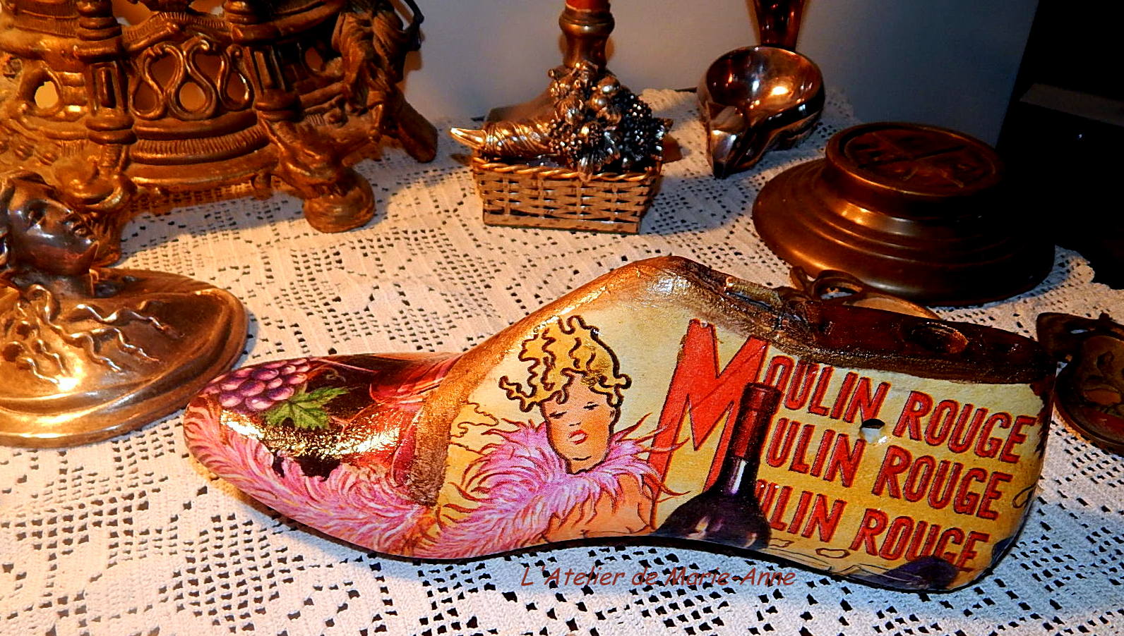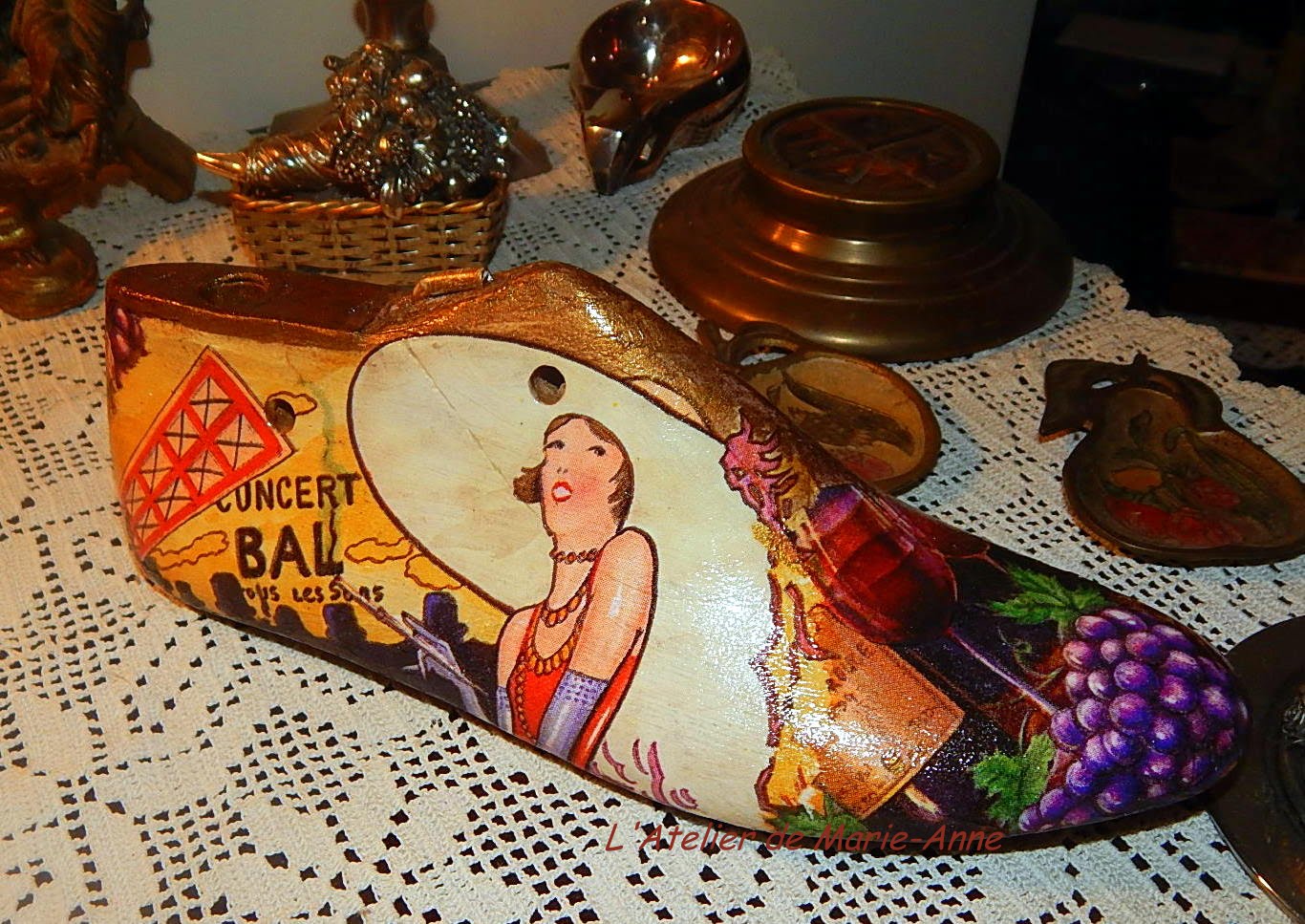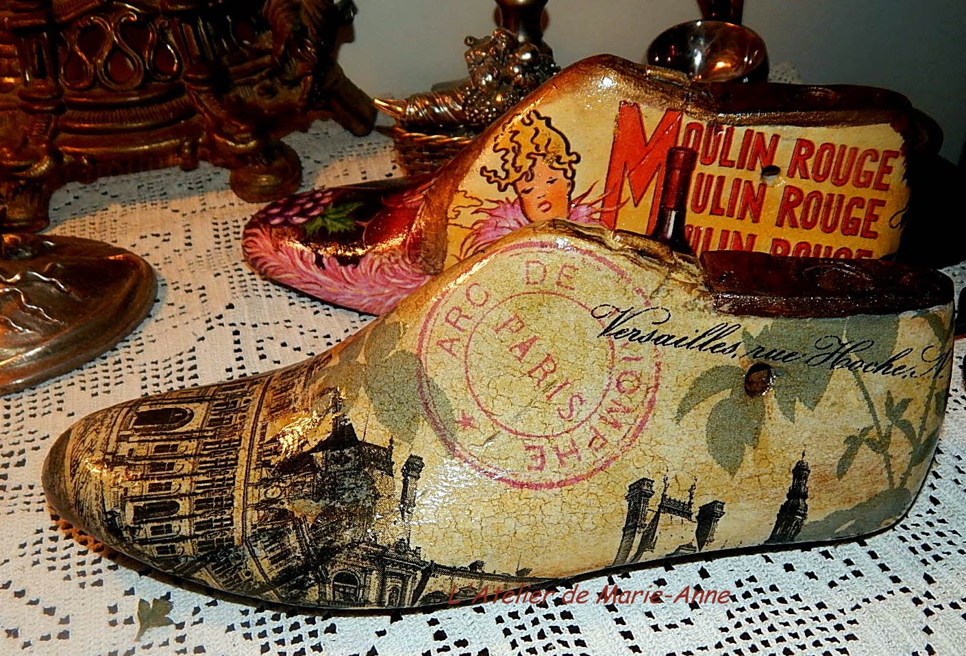 I so much liked this decoupaged vintage shoe tree, that I wanted to decoupage one myself. One day, my daughter brought me a pair she had found at the flea-market and some time later, my uncle gave me another pair, but they all have been patiently waiting in the store room until some days ago, when I decided it was about time to decoupage two of them, with no calendar though, which I then offered to... my daughter!
