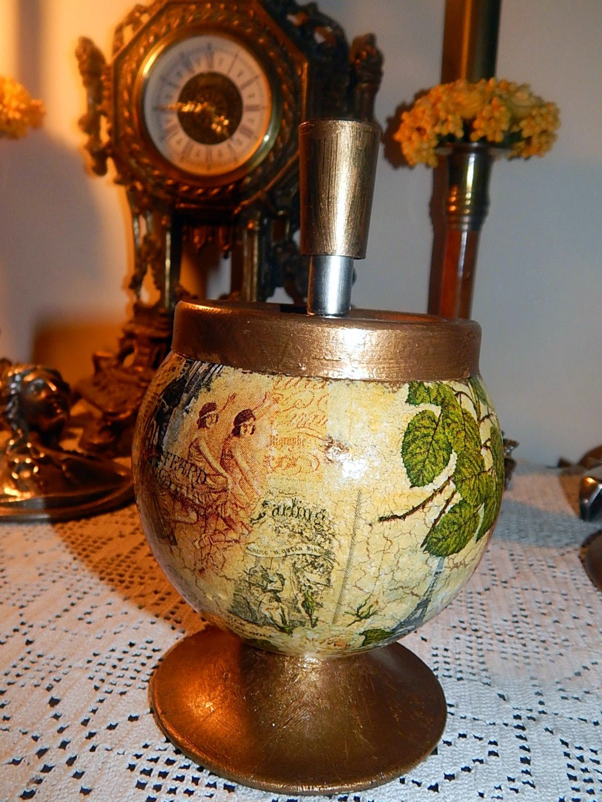 Another transformation I made, using a vintage Parisian themed napkin, was to a metal push spin ashtray which became as decorative an item as the shoe trees.