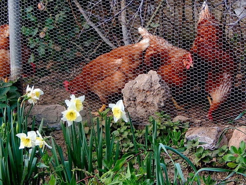 'Ενα κοκοράκι που είχαμε αγοράσει, δεν μπόρεσε ν'αντέξει τα τσιμπήματά τους, κι έτσι μείναμε με τον διακοσμητικό κόκορα που τις κοιτάζει αφ'υψηλού!