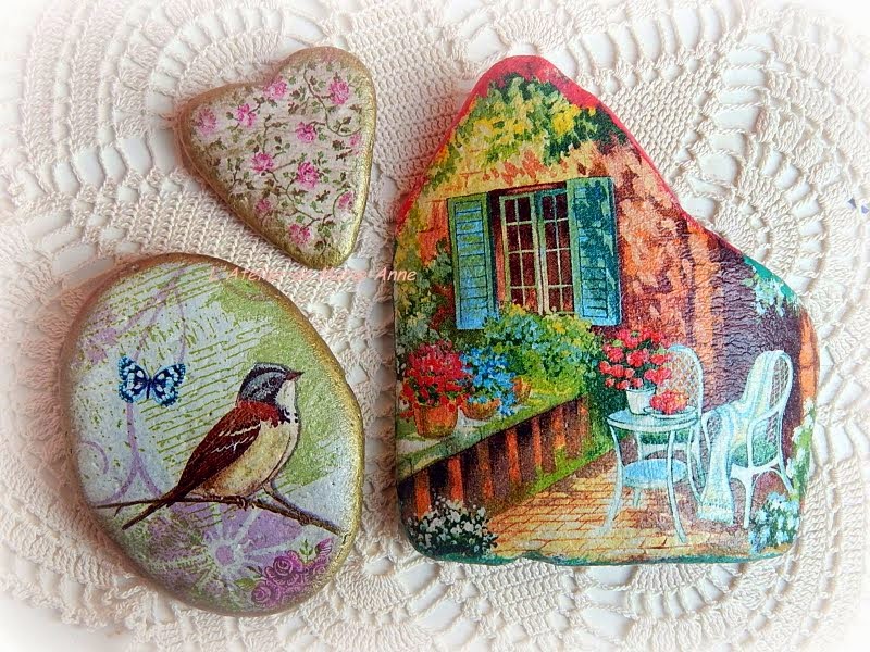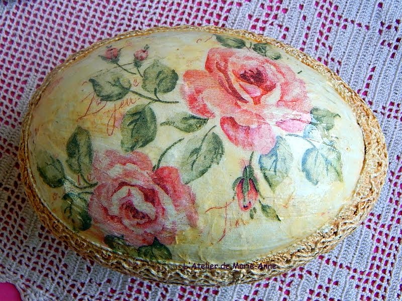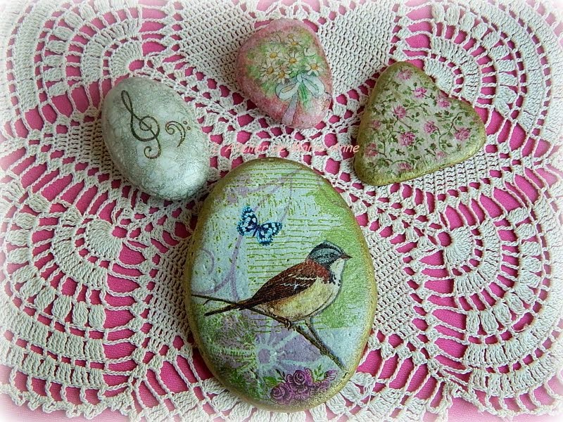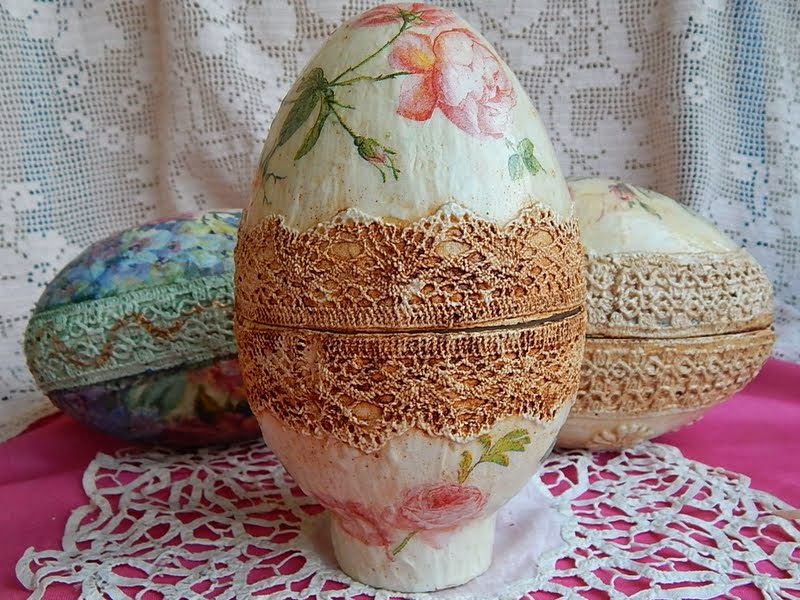 Decoupage με χαρτοπετσέτες, κρακελέ one step, πατίνες, δαντέλλες και κορδελίτσες.