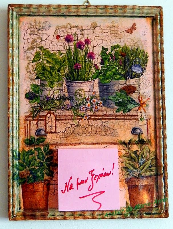 A wall memo pad with crackling medium, napkin decoupage and patinas