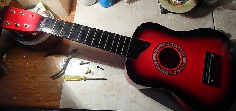 Πώς όμως θα έστελνα μιά κιθάρα χωρίς χορδές? Αφού λοιπόν κι εγώ έκανα μερικά ξενύχτια φτιάχνοντας την κιθαρίτσα, άρχισα μετά να ψάχνω στο ιντερνετ και έμαθα πως λέγονται τα διάφορα μέρη της κιθάρας, πως τοποθετούνται οι χορδές, πως δένονται στην 'γέφυρα' περνώντας πάνω απο τον 'καβαλάρη' και μετά στα 'κλειδιά' , πώς κουρντίζεται μια κιθάρα...και την έφτιαξα!!! Και παίζει, άσχετα αν εγώ δεν ξέρω νότες. Κι αν κάποιος ενδιαφερθεί να την αγοράσει, ας με συγχωρέσει που δεν τις έβαλα αληθινές χορδές, αλλά από χοντρή πετονιά (θα μπορούσε να τις αλλάξει μόνος του ή να την κρατήσει για διακόσμηση σ'ένα παιδικό δωμάτιο).