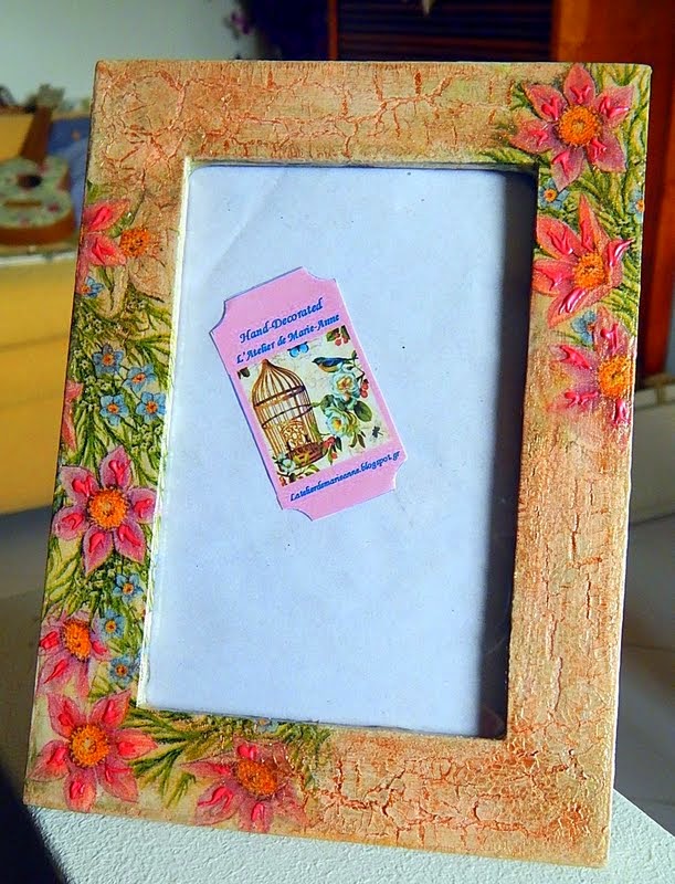 A photo frame with napkin decoupage, crackling medium and patina.