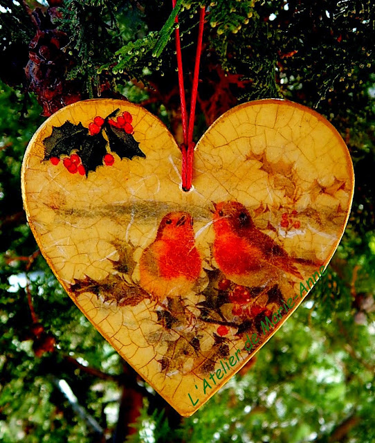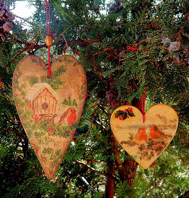 Christmas tree decorations with napkin decoupage on recycled wooden boxes of french cheese