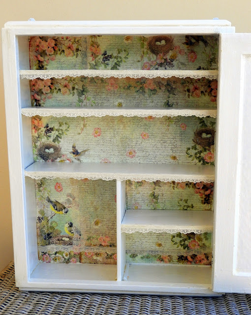 Χρησιμοποίησα λευκό χρώμα κιμωλίας πάνω από την παλιά λαδομπογιά. Στο εσωτερικό κάπως δυσκολεύτηκα, γιατί τα ραφάκια είχαν ποτίσει με ιώδιο που όσο κι αν το έβαφα, αυτό ξανάβγαινε στην επιφάνεια. Αναγκάστηκα και πέρασα βελατούρα και ξανά πάλι δύο χέρια κιμωλίας. Στο τέλος μου ήρθε η φαεινή ιδέα!  Τόσα ρετάλια από ριζόχαρτα είχα, που είχαν μείνει από όσα είχα φτιάξει στον γάμο της Κατερίνα μου.  Ευκαιρία να τα αξιοποιήσω.