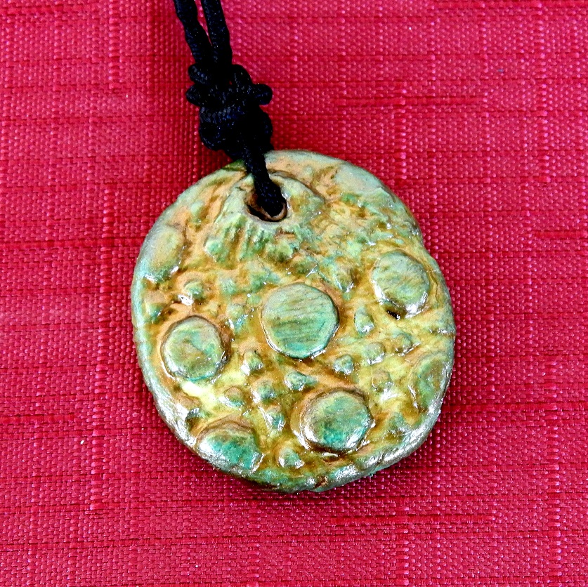 και αφού το έβαψα και το πέρασα με βερνίκι, έγινε ένα μικρότερο μεν αλλά αρκετά συμπαθητικό μενταγιόν! Η χάντρα είναι κι αυτή πήλινη.