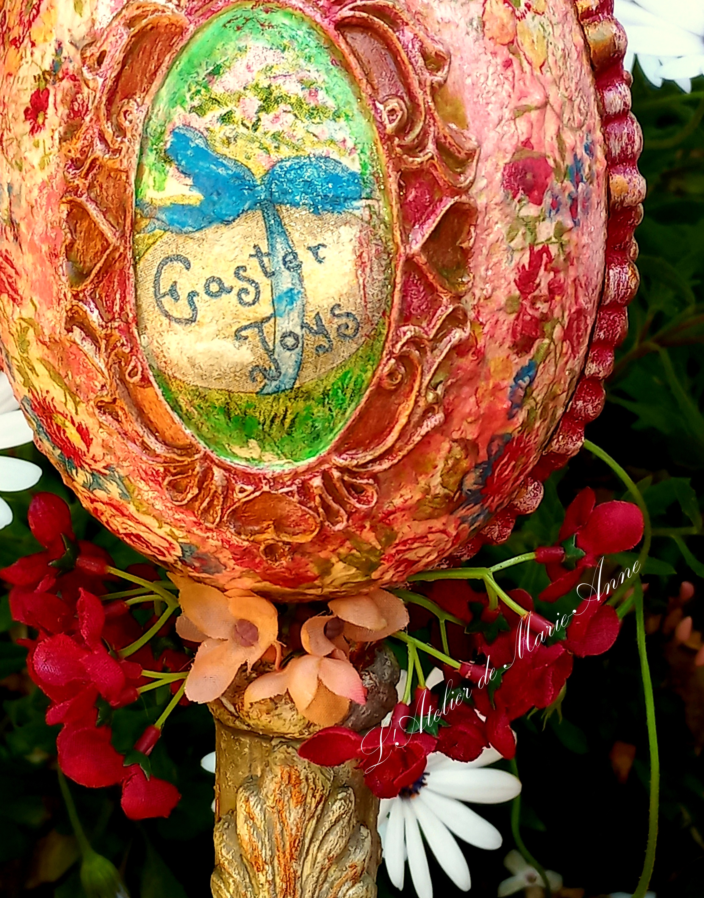 Μέσα στην βαφή των αυγών, βούτηξα και τρία μικρά πλαστικά που είχα αφήσει ατελείωτα από πέρυσι, με εφφέ πέτρας και ανάγλυφα από πηλό. Πήραν λίγο χρώμα, αλλά συμπληρώθηκε με χρυσή δακτυλοπατίνα πάνω στα πήλινα στοιχεία τους.