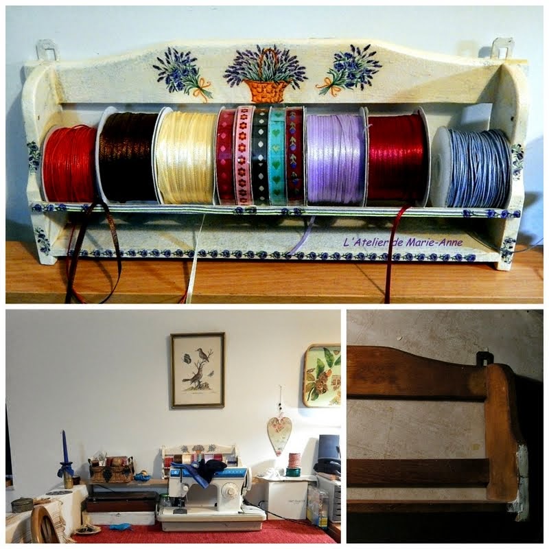 Στην γωνιά ραπτικής, μία παλιά και σπασμένη βάση μπαχαρικών μετατράπηκε σε ραφάκι για κορδέλες