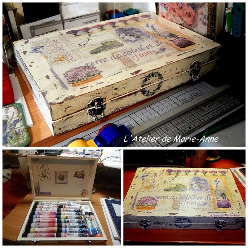 μεταμορφώθηκε με παλαίωση και μ'ένα χαρτί decoupage που μου είχε χαρίσει η Dimi, και φιλοξενεί πλέον τις πάστες περιγράμματος, ρελιέφ, κλπ.