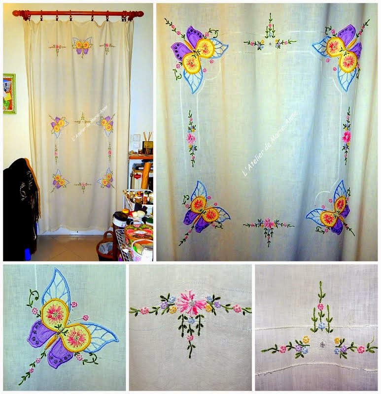 Στην μπαλκονόπορτα, σε κουρτινόξυλο που είναι κι αυτό από το φοιτητικό σπίτι της κόρης μου, αντί κουρτίνας, κρέμασα ένα παλιό σεντόνι της αδελφής του μπαμπά μου. Πρέπει να έχει ηλικία άνω των 70 ετών!!! Το κρατούσε η μεγάλη μου εξαδέλφη σαν κειμήλιο της μαμάς της, και μου το χάρισε πριν από πολλά χρόνια. Μόνο οι απλικέ πεταλούδες είναι σχεδόν ανέπαφες, ενώ το υπόλοιπο κέντημα