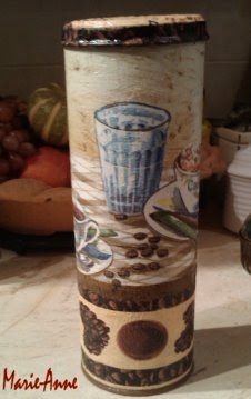 και σκόπευα να κάνω άλλο ένα μεγαλύτερο μπουκάλι. Μου τελείωσε όμως το χαρτί και τότε ήταν που θυμήθηκα ότι στο κουτί είχα δεί και μία τσαντούλα από την γνωστή αμερικάνικη αλυσίδα καφέ... κι έτσι μου ήρθε η ιδέα. Αντί για μπουκάλι, γιατί να μην φτιάξω ένα βάζο για τον καφέ????? ' Ετοιμο το είχα, με σκοπό, κάποτε, να του κάνω decoupage.... !!