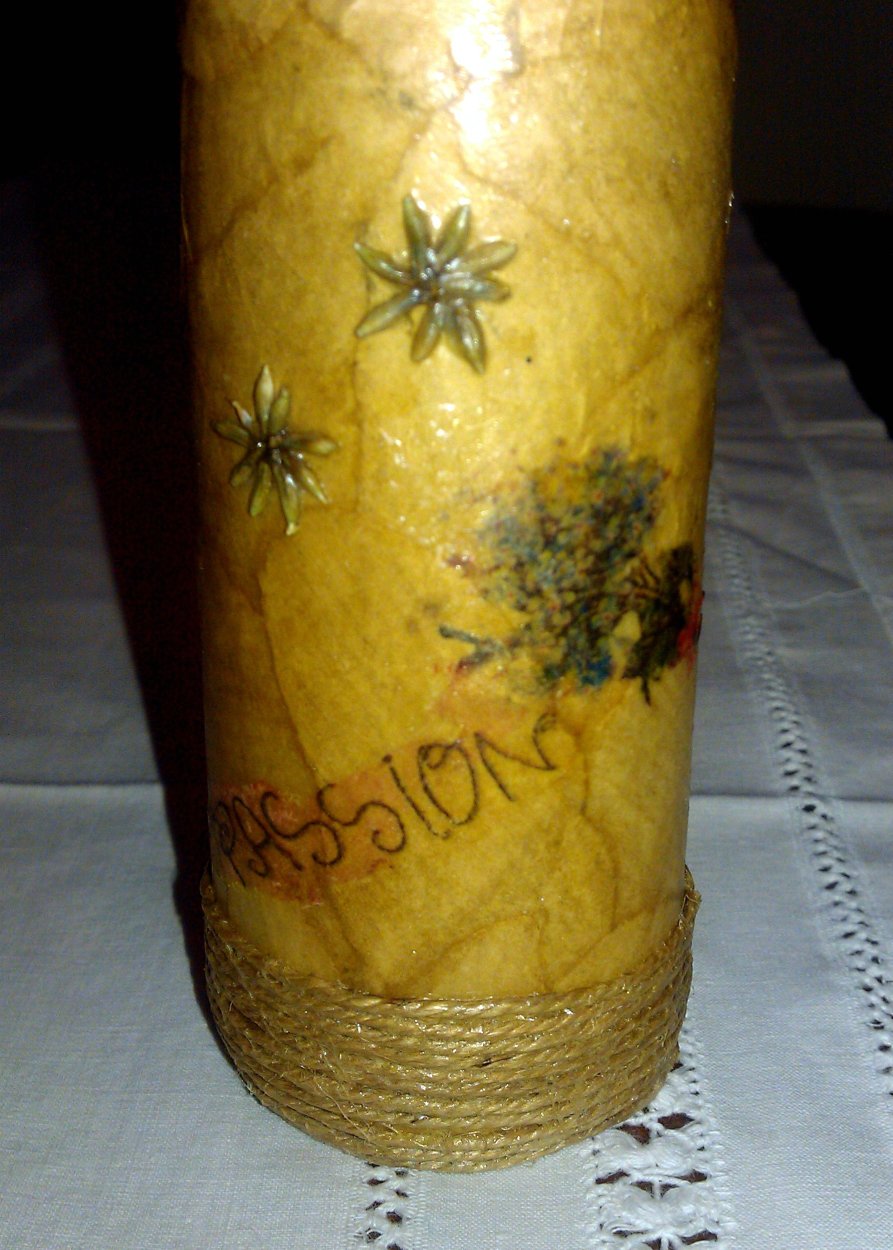 Στην συνέχεια πέρασα ελαφρά το μπουκάλι με bitume, το οποίο 'πότισε' περισσότερο τις ενώσεις, και αφού στέγνωσε, κόλλησα τον σπάγγο, ελάχιστα ανθάκια λεβάντας, του έκανα ένα μικροσκοπικό decoupage, έτσι για να μην ξεχνιόμαστε, και το πέρασα με βερνίκι.