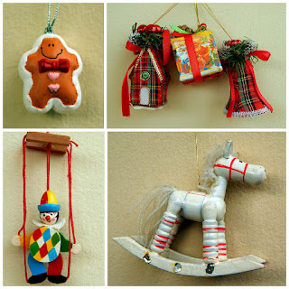 ένα περυσινό στολίδι (αυτό με τις κουκουβάγιες) φτιαγμένο από φέτα κορμού και δύο φετεινά στολιδάκια, που έφτιαξα από φέτες ενός μικρού οβάλ θαλασσόξυλου