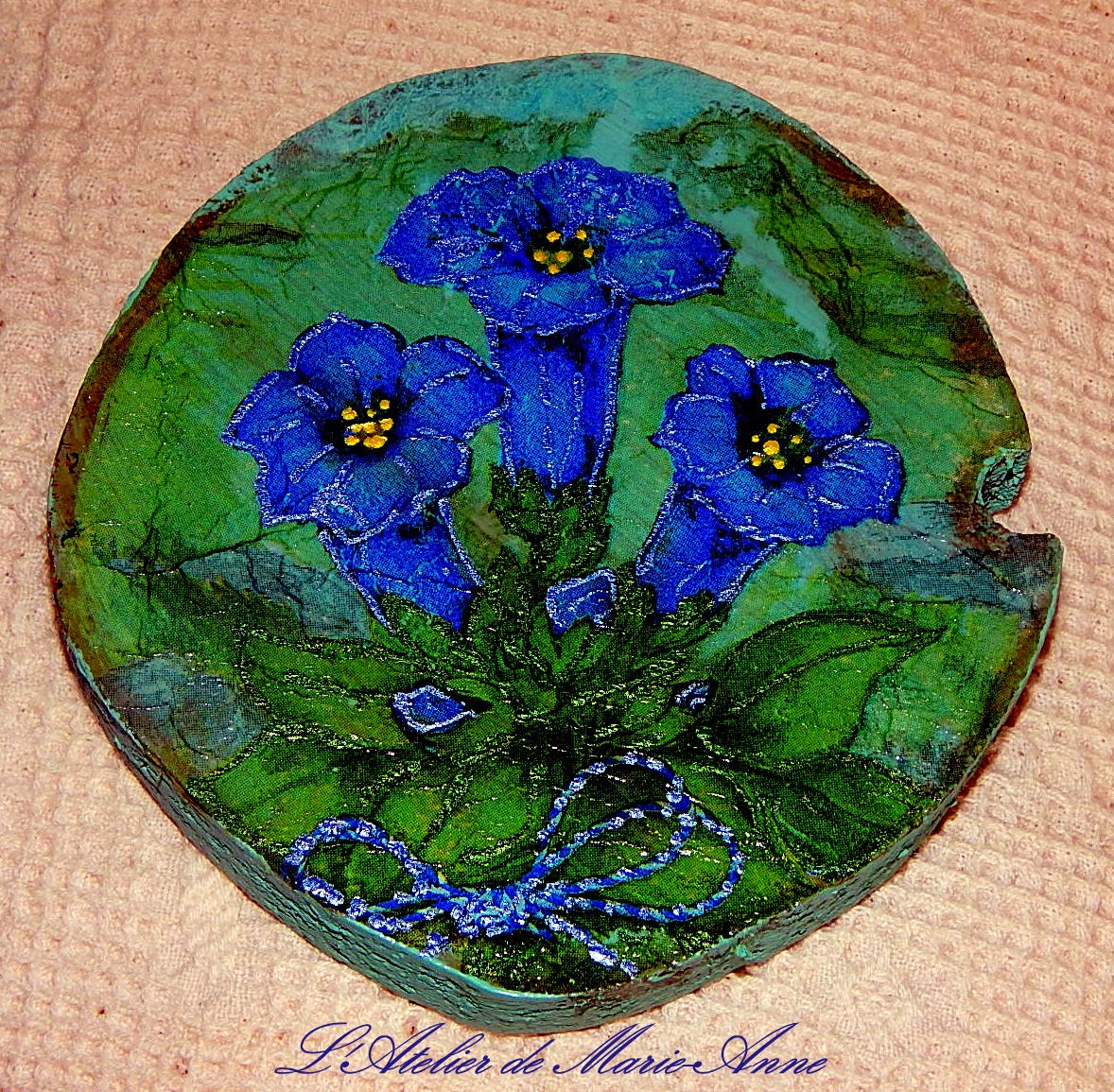 'Εκοψα τα κεντημένα φυλλαράκια, τα βούτηξα σε αραιωμένη ατλακόλ και κόλλησα από ένα σε κάθε γωνία της βάσης.