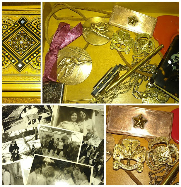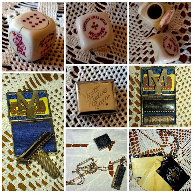 ανακατεμένα με κάποια περίεργα σουβενιράκια απ'αυτά που μου έφερναν οι θείες μου από το εξωτερικό και μου έκαναν τότε εντύπωση, αλλά τα βλέπω πλέον ως 'συλλεκτικά' στο διαδίκτυο, όπως ένα ζάρι που κρύβει μέσα του ένα άρωμα Molinard σε κρέμα, μία μίνι ξυριστική μηχανή (2Χ1εκ.), μιά μίνι φυσαρμόνικα-μενταγιόν και άλλα ψιλολόγια.