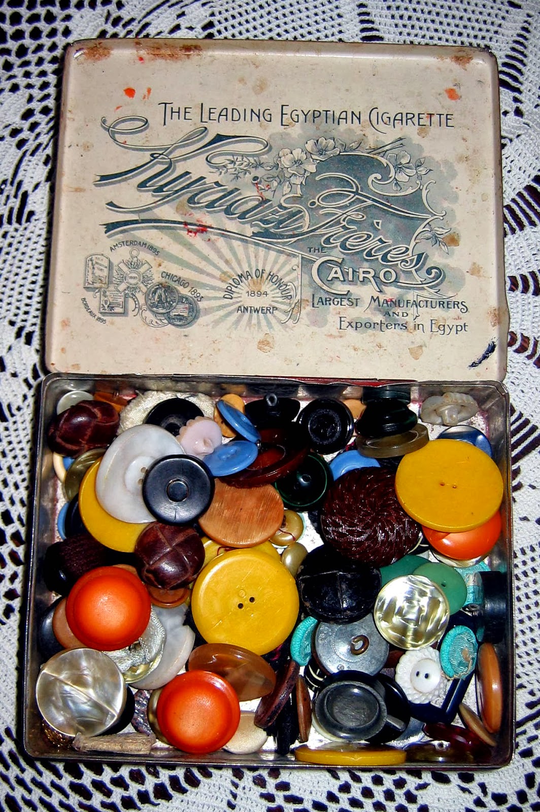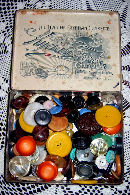 Στο ίδιο συρτάρι, βρήκα δύο κουτιά γεμάτα παλιά κουμπιά. Μερικά είναι πολύ όμορφα και μάλλον θα τα χρησιμοποιήσω κάπου. Το μικρότερο κουτί μου τράβηξε την προσοχή. Πραγματική αντίκα!!
