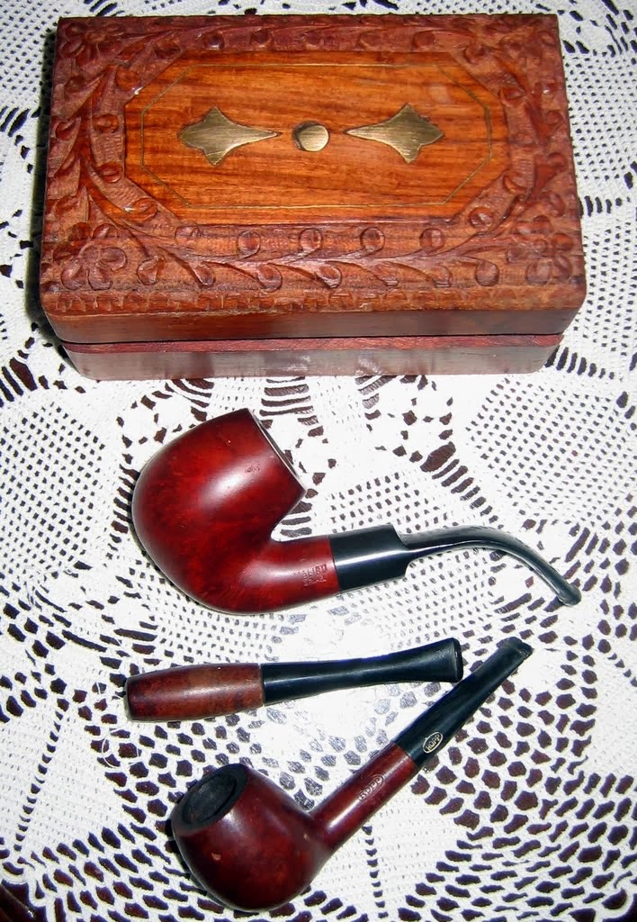 Η μία είναι γαλλική πίπα του εργοστασίου ROPP, μοντέλλο six, η μεγάλη κυρτή γράφει επάνω της Malibu briar (υποθέτω πως θα του την είχε φέρει η θεία Νίνα από την Αμερική) και η μικρή είναι πίπα για τσιγάρο.