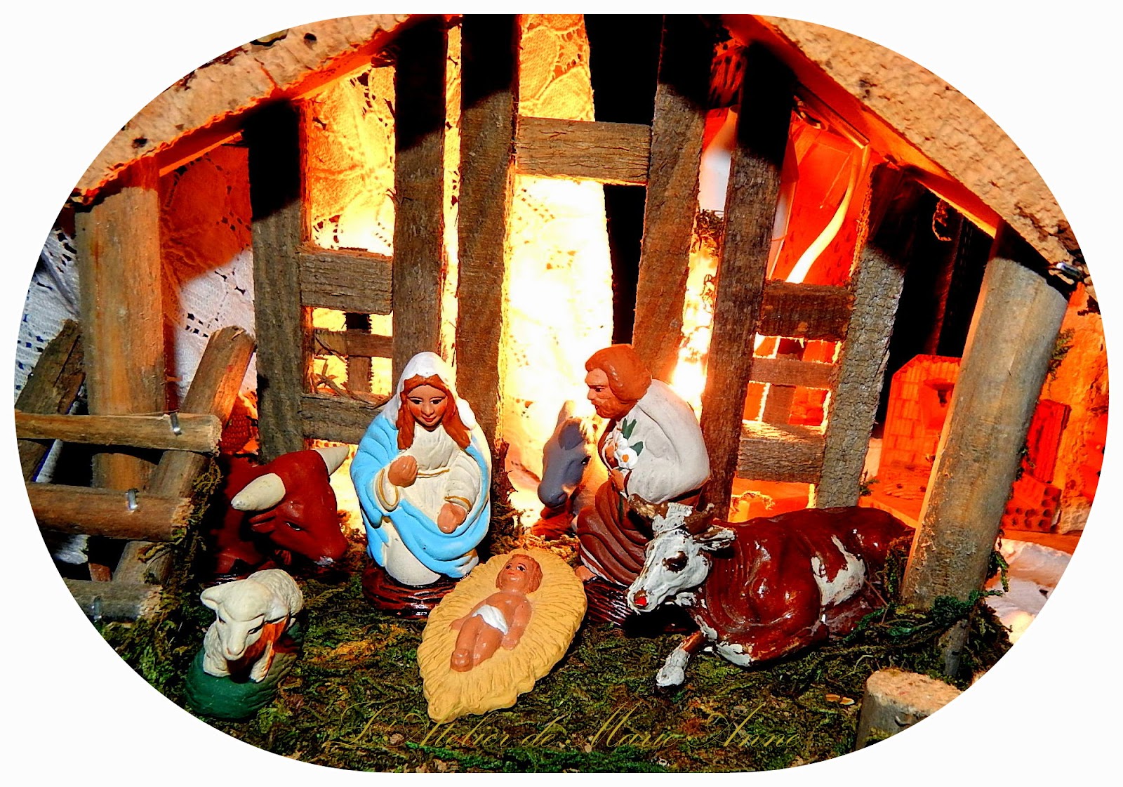 Πάνω στα άχυρα και στις λινάτσες, ξάπλωσαν το γαϊδουράκι που οδήγησε την Παναγία στην Βηθλεέμ και δύο αγελάδες που με τα χνώτα τους ζεσταίνουν τον νεογέννητο Χριστό