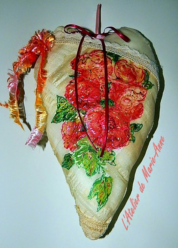 ...έκανα ντεκουπάζ με την ειδική κόλλα για ύφασμα,  συμπλήρωσα με κόκκινο, πράσινο και χρυσό ρελιέφ,   έραψα μιά καρδούλα και την στόλισα με δαντέλλα και κορδέλλες. Είχα ξεχάσει να σας την δείξω. Να όμως που ήρθε η ώρα να "μπαλώσει" μιά κατάσταση και παράλληλα ταίριαξε και με την σημερινή ημέρα των ερωτευμένων!!!