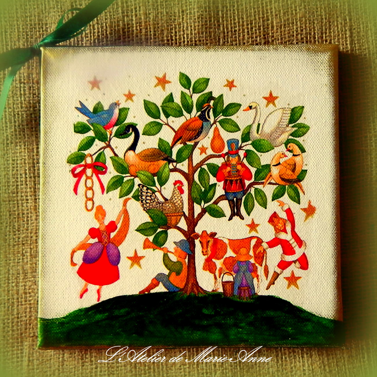 ήταν στο κέντρο μιάς κάρτας που είχε γύρω-γύρω λευκά ανάγλυφα φυλλαράκια και ανθάκια houx. Πριν από χρόνια ήδη τα είχα τονίσει με πράσινο, κόκκινο και χρυσό,