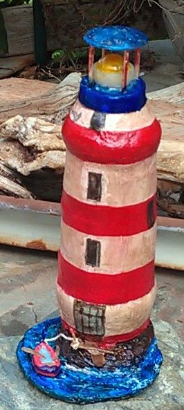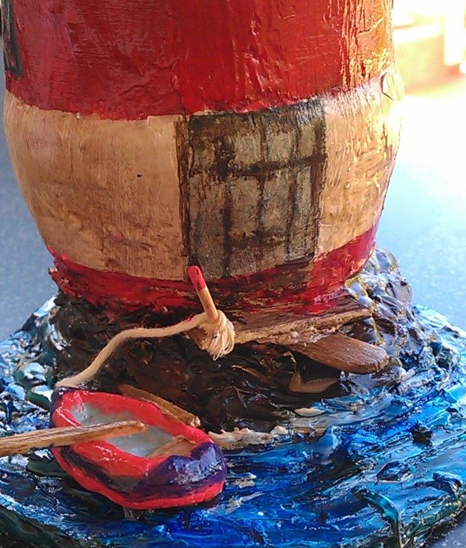 I did not need a lot of materials. Some imagination, the small ball from a deodorant, a mini ‘table’ from a box of pizza, some plaster bandage, crackle pasta, a tiny amount of clay, the beloved paper glue plus a glue gun, some acrylic colours, and… my lighthouse was ready!